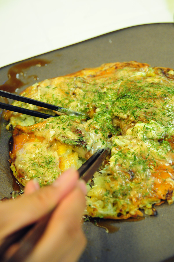 このお好みは「周りカリッと、中しっとりタイプ」です。キャベツからお水が出るので、いかに水を押さえるか、いかに水分を出させるかがポイントです。チーズ思いっきりやいちゃってください。水分が抜けたこんがりチーズも、なかなか美味しいです♪